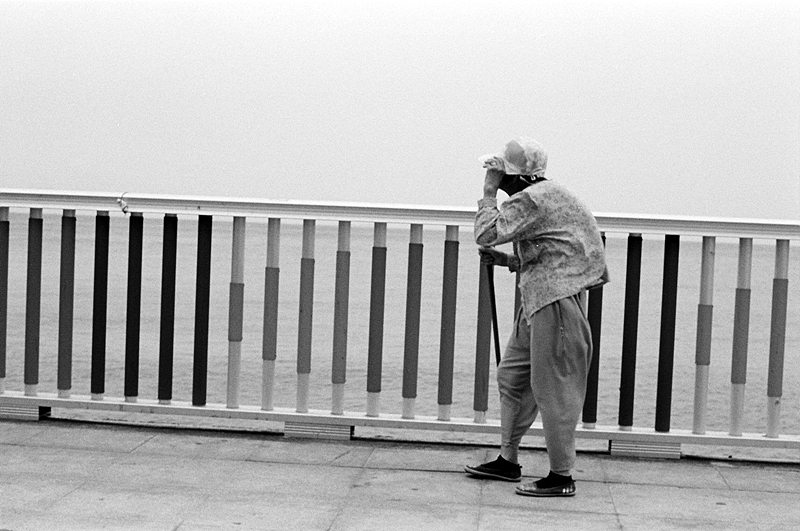 모자가 바람에 날려가지 않으려고 붙잡고 힘들게 걸어가시는 할머니..