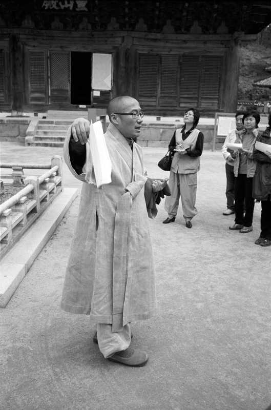 설교하는 스님과 경청하는 신도들의 진지한 표정이