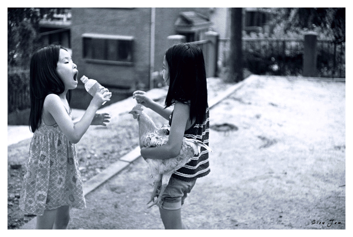 귀여운 소녀들의 갈증, 닭도 애절한 눈빛으로 물병을 바라보네요.^^