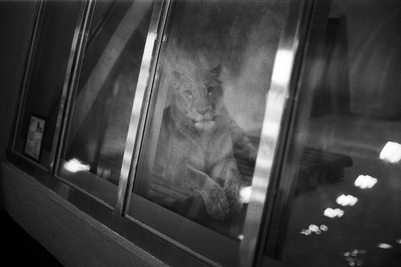 유리창 프레임 안의 사자가 초상화처럼 보입니다..