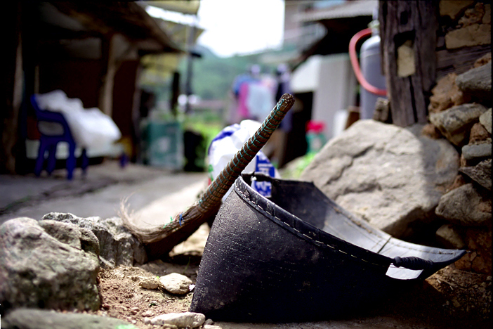 - 설명농가의 작은 마당 한 구석에 서 있는 빗자루와 쓰레받기.