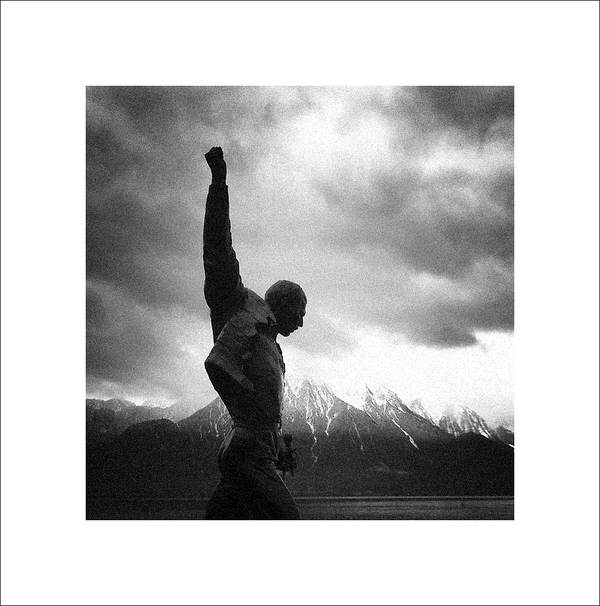 사진의 프레디 머큐리(동상)의 자세와 하늘 상태와 알프스 준봉들과 호수 배경이 거친 질감과 어울리지 않을까 해서 추가해 보았습니다. 원래는 이보다 훨씬 결이 고운 칼러 사진입니다. 물론 아이폰이 만드는 딱 그 정도에 불과하겠습니다만...