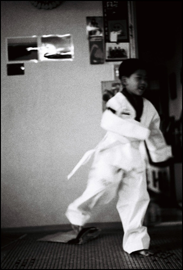 태권도 옷을 처음 입고 폼 잡고 있습니다.