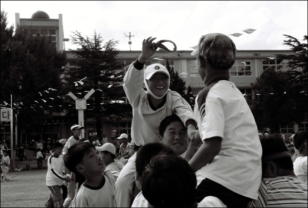 "기마전" 참으로 오랜만에 봅니다. 기마전의 기본은 모자를 뒤로 써야 우리한데... 웃는 얼굴을 보니 이겼는 가 봅니다. 머리 띠를 빼앗는 사람이 이기는 가 봅니다. 그 웃음이 있어 좋은 사진...Thanks.