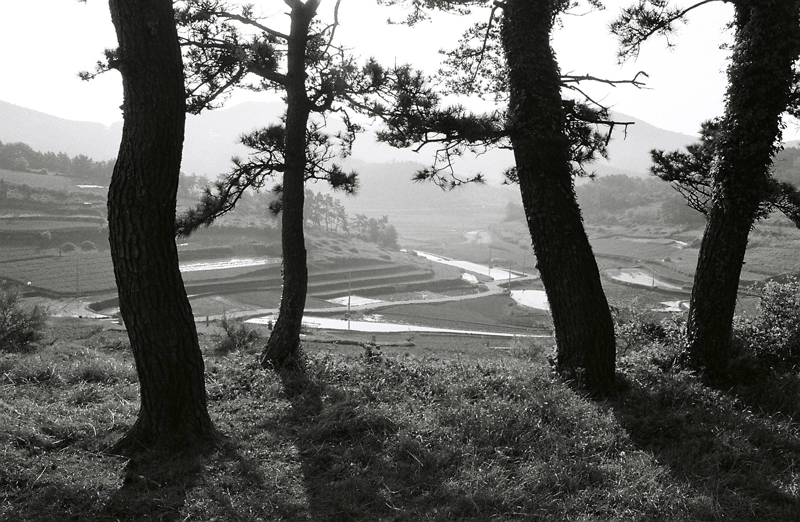 멀리 보이는 논을 배경으로 역광에 나무 그림자..
