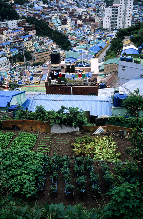 성냥갑만한 크기의 아파트와 조그만 텃밭의 크기가 자연스럽게 대조 되면서
