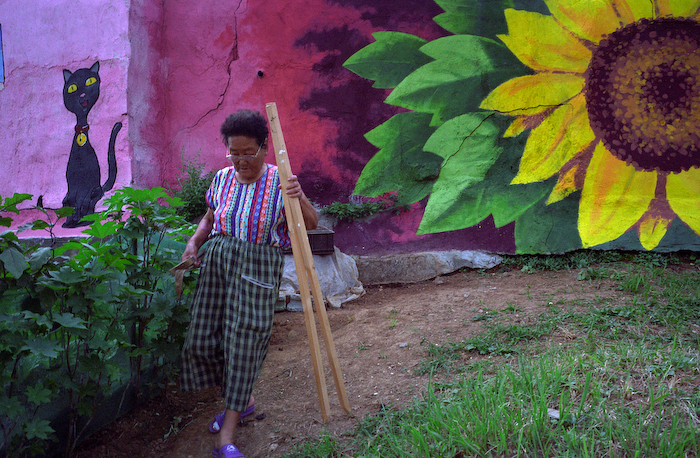 할머니가 텃밭에 말뚝 박으러 가신다.