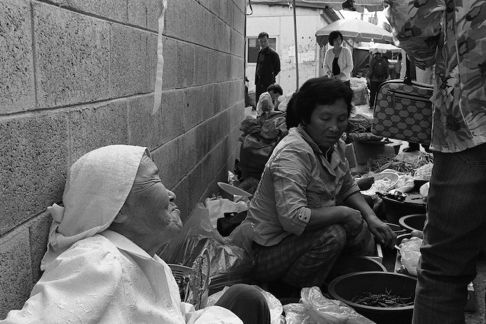 대야 놓고 행상하시는 분들, 다들 비슷한 것을 팔다보니 손님 없을 땐 화기애애한 분위기지만,