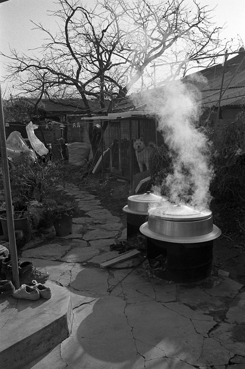 솥 뚜껑을 약간 열어 두었는데 뭘 끓이는 것인지....