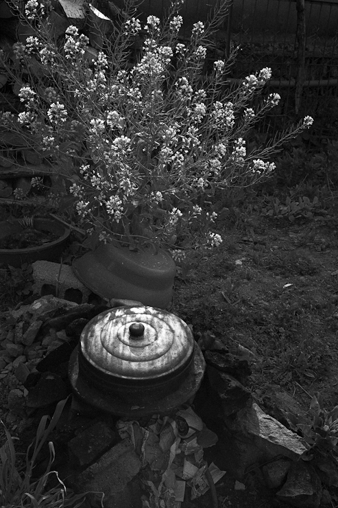 솥뚜껑과 꽃... 전혀 같이 있을법하지 않은 상태에서 같이 어울렸네요.