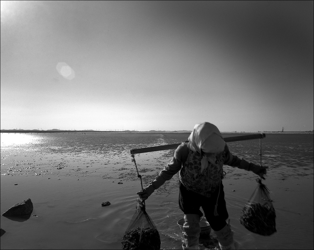 로디날이 그은 수평선을 원경으로 균형미를 느끼면서 근경의 아주머니의 비틀 거리는 움직임을 담으신 것이 균형의 미에 리듬감을 주는 멋진 구도의 사진입니다.