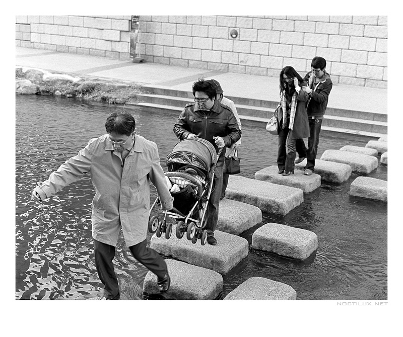 유모차를 들고 돌다리를 건너는 모습이 약간 위험해 보이네요..