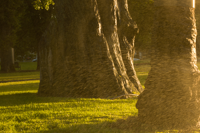 아침빛과 스프링쿨러가 뿜어내는 물이 환상적인 풍광을 만듭니다.