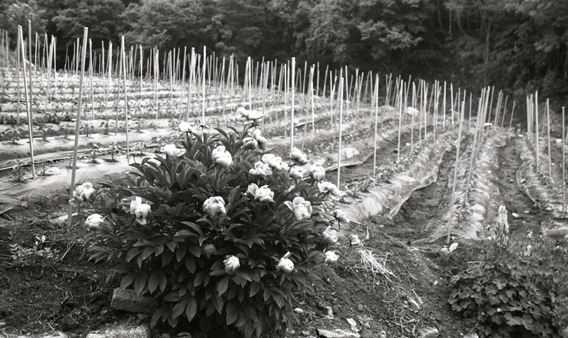 밭뚝에 탐스럽게 핀 함박꽃(작약) 그리고 꽃은 지고 열매 맺은 매발톱꽃이 보이는군요.