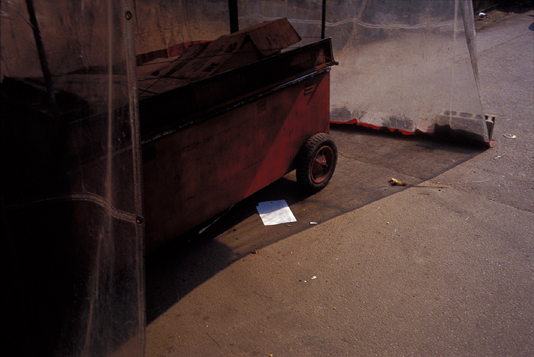 이 사진, 첫 느낌이 아주 좋습니다. 사진이 보는 사람에게 말을 걸고 있지 않습니까? 가라 앉은 색채와 중앙의 흰종이가 보는 이로하여금 어제든 그제든 카트 주위에 사람들이 둘러서서 이런 저런 대화를 나누었을 것같은 환영에 빠지게 만듭니다. 생계의 느낌, 서정적 느낌도 닥아오지만, 그보다 저는 이 사진을 보며 흘러간 그리고 지나간 대화 이미지에 더 강하게 빠지고 있습니다.