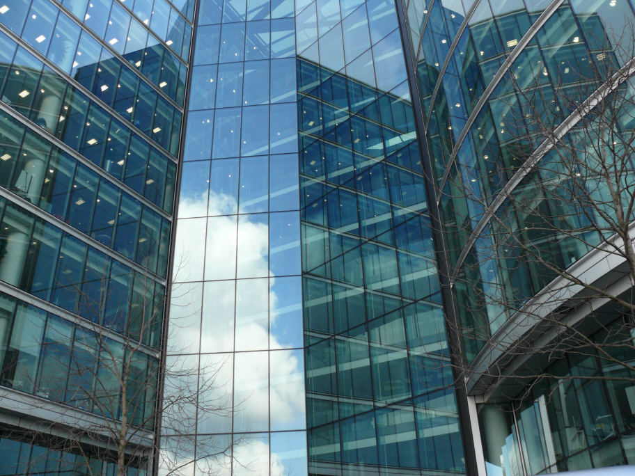 - 설명지나던 빌딩에 비친 구름과 삭막한 유리창으로 손을 뻗는 나무들을 보면서