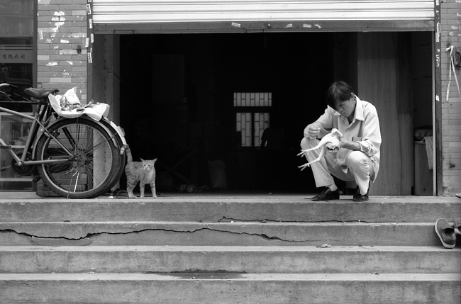 닭 다듬는 사람과 고양이