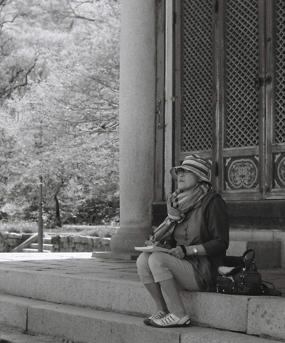- 설명대웅전 앞마당에 있는 탑을 열심히 스케치하고 있는 예술가(?).