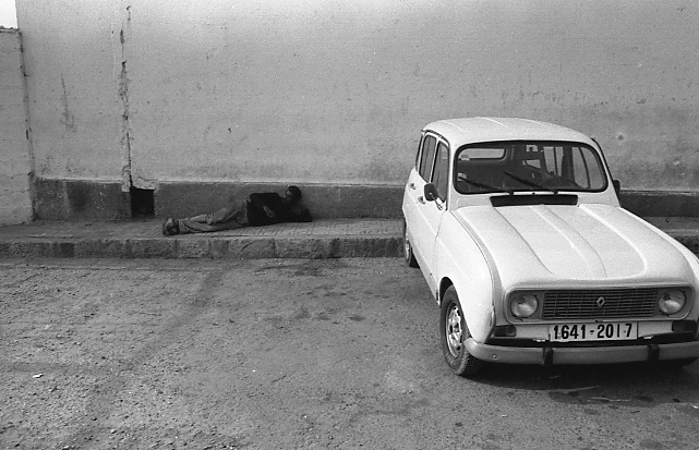 낡은 차와 길바닥에서 휴식하는 사내가 공허함을 느끼게 합니다.