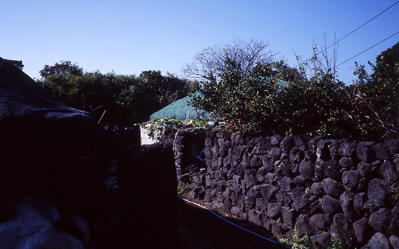 - 설명화산암으로 담장을 올리고 바람의 피해를 줄이려고 검고 푸른 나일론 그물망을 이용한 지붕들.