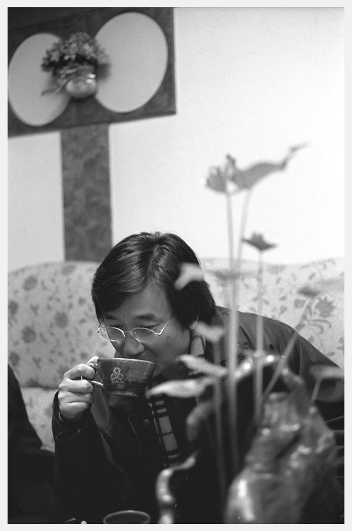 찻잔을 잡은 오른손의 검지와 중지가 셔터 누름에 단단이 단련된