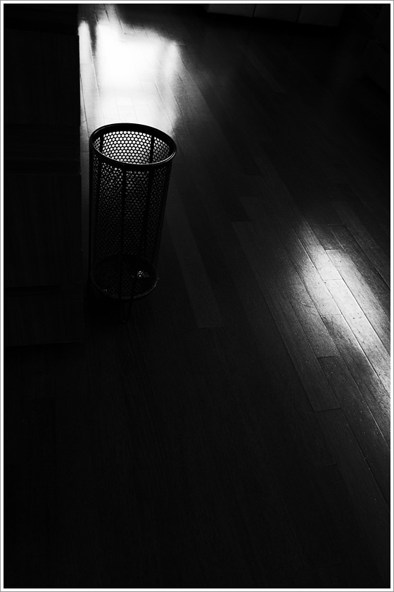 마루의 목재 질감과 철재 쓰레기통의 금속광택이 묘하게 어우러 지는군요,