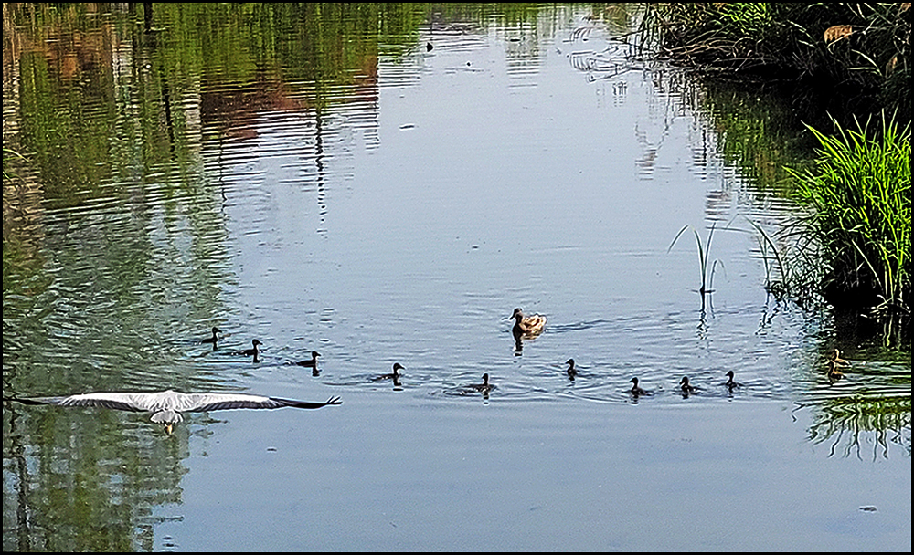 - 설명이소여행 중인 오리들 옆을 왜가리 한 마리가 날고 있다.