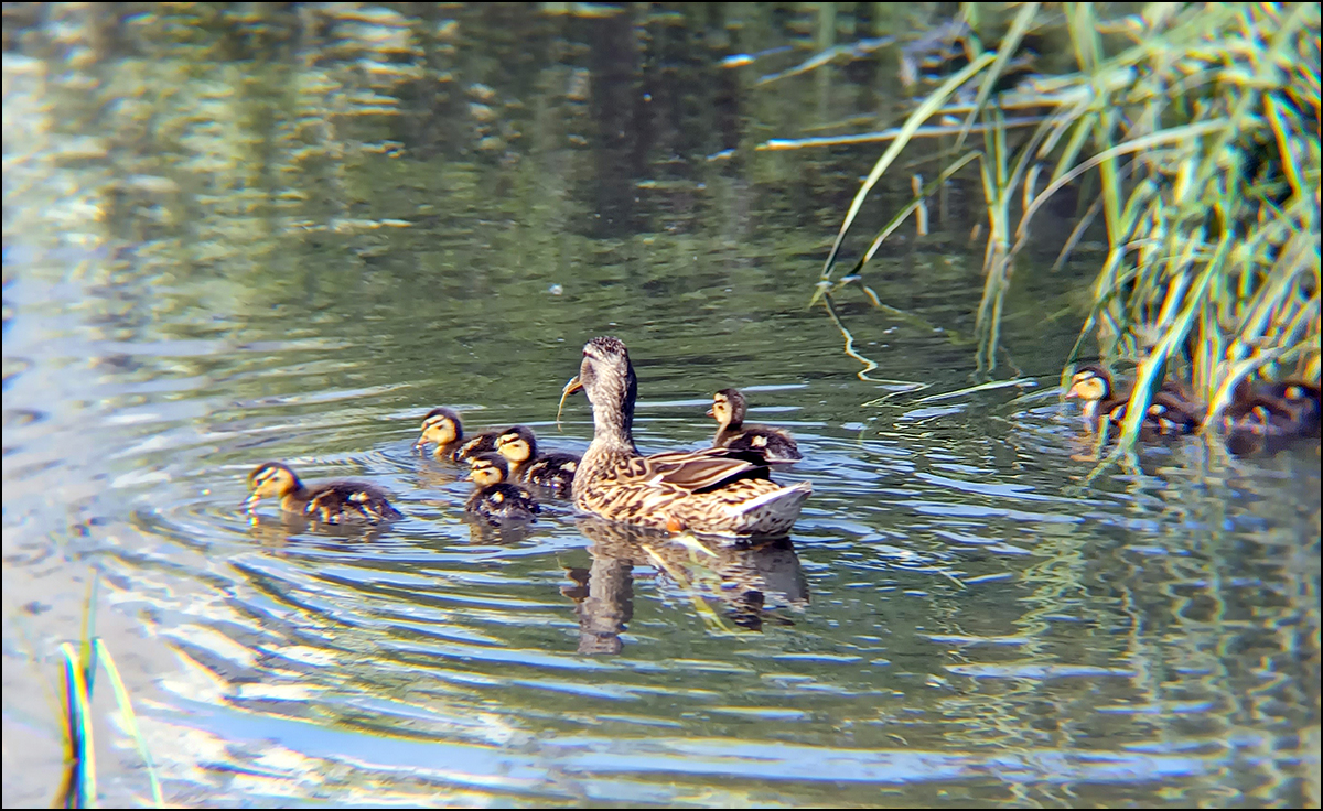 - 설명갓 태어난 아기청둥오리들이 어미 곁에서 헤엄치고 있다.