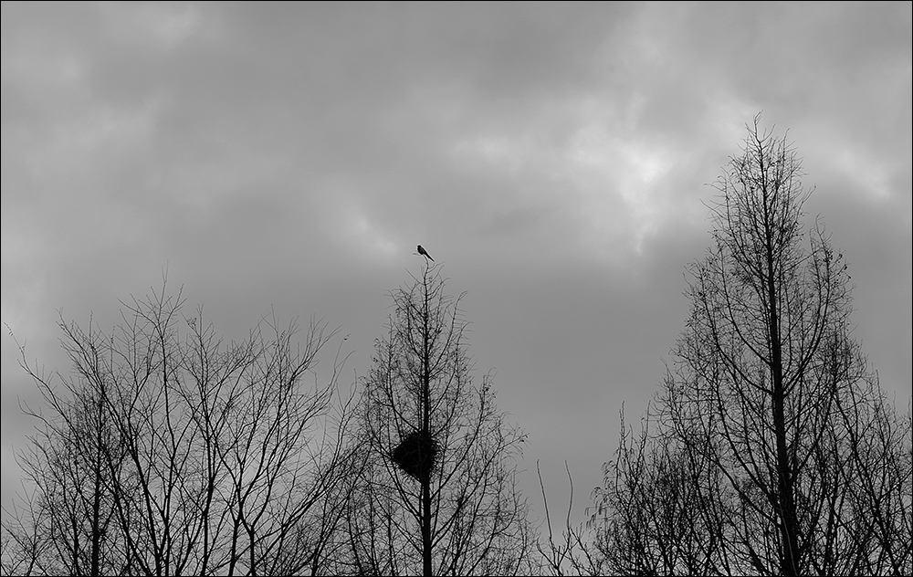 - 설명둥지 위 나무 꼭대기에 앉아있는 까치에게서