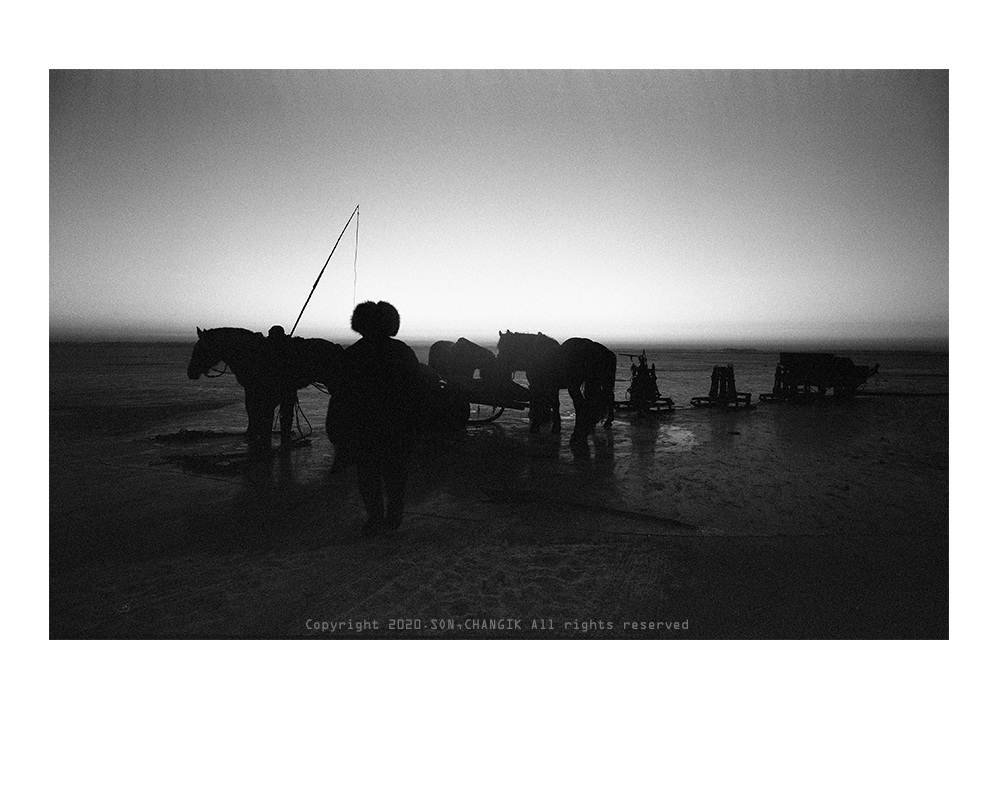 우선 얼음에 구멍을 뚫고 그물을 넣어야 한다.. 그런다음...말의 힘을 이용해 당기면서 전진해 나가면서 그물을 활짝 펼쳐나간다.