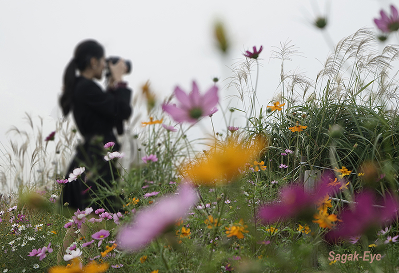 - 설명카메라를 든 여인,만개한 꽃이