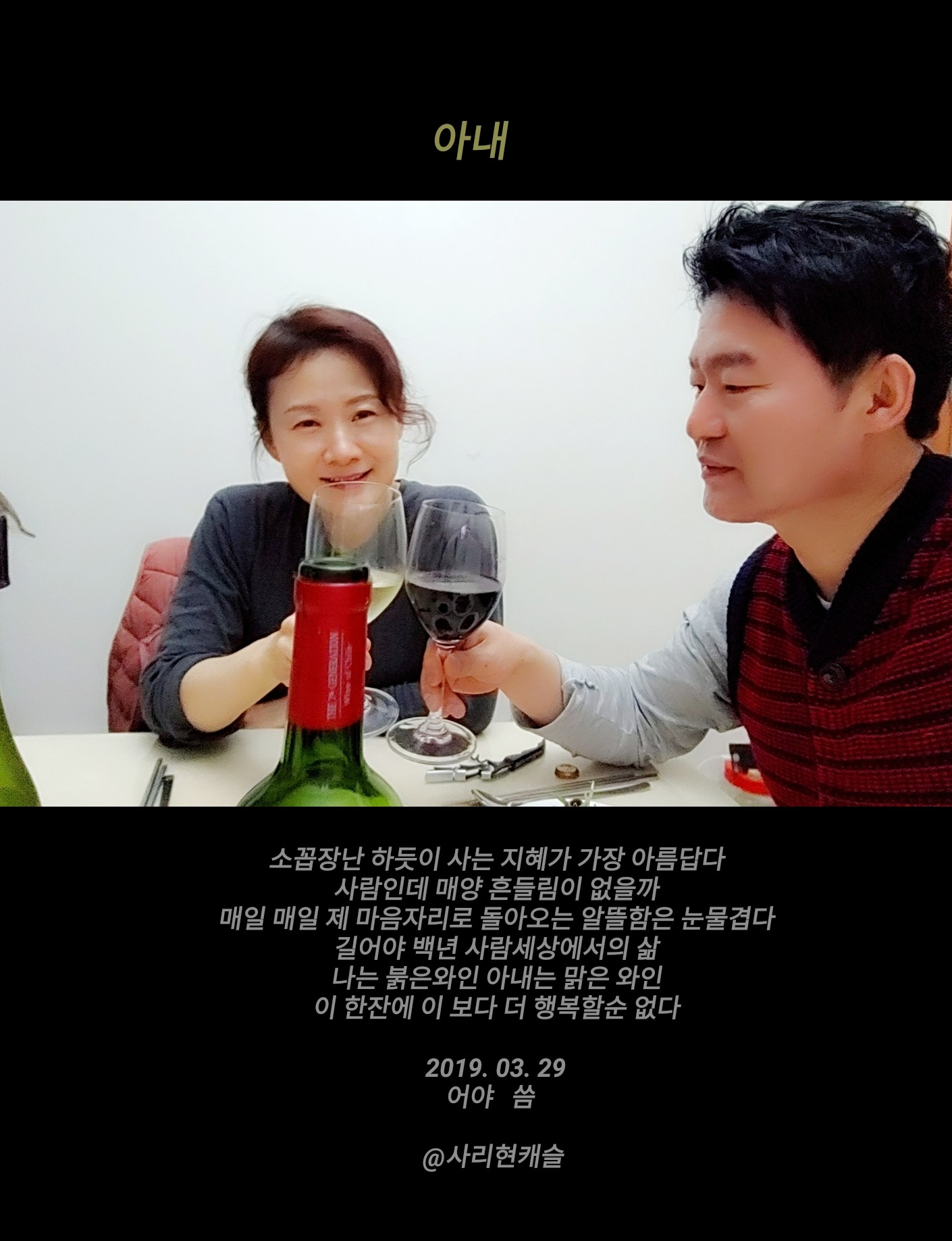 아내 허영주 디지털 칼라 관련링크 본문 페이지 정보 작성일 : 19-03-29 20:31 820 4 8 추천하기이 사진을 추천합니다 허영주님 사진 모두보기 + 설명. 아내 소꼽장난 하듯이 사는 지혜가 가장 아름답다 사람인데 매양 흔들림이 없을까 매일 매일 제 마음자리로 돌아오는 알뜰함은 눈물겹다 길어야 백년 사람세상에서의 삶 나는 붉은와인 아내는 맑은 와인 이 한잔에 이 보다 더 행복할순 없다 2019. 03. 29 어야 씀 @사리현캐슬 . 다음 사진 이전 사진 목록 추천 8 댓글목록 한용운님의 댓글 한용운 19-03-29 22:04 두분의 다정한 모습에 행복이 느껴집니다 기쁨가득 행복하세요 두분의 다정한 모습에 행복이 느껴집니다 기쁨가득 행복하세요 허영주님의 댓글 허영주 19-03-29 22:44 인용: 원 작성회원 : 한용운 두분의 다정한 모습에 행복이 느껴집니다 기쁨가득 행복하세요 고맙습니다^^~ <!-- BEGIN TEMPLATE: bbcode_quote_new --> <div style="margin:5px 15px 10px; "> <div style="font-size:0.9em;margin-bottom:2px;">인용:</div> <table cellpadding="" cellspacing="0" border="0" width="100%"> <tr> <td class="alt2" style="border:1px inset #ddd;text-align:left;padding:10px 20px;"> <div style="font-size:0.9em;margin-bottom:5px;"> 원 작성회원 : <strong>한용운</strong> </div> <div style="font-style:italic">두분의 다정한 모습에 행복이 느껴집니다 기쁨가득 행복하세요</div> </td> </tr> </table> </div> <!-- END TEMPLATE: bbcode_quote_new --><br /> <br /> <br /> <br /> 고맙습니다^^~<img src="/img/smilies/biggrin.gif" border="0" alt="" title="Big Grin" class="inlineimg" /> 박영욱님의 댓글 박영욱 19-03-30 15:43 사모님이 미인이셔요 행복한 모습도 좋구요 사모님이 미인이셔요<br /> 행복한 모습도 좋구요 허영주님의 댓글 허영주 19-03-30 18:19 인용: 원 작성회원 : 박영욱 사모님이 미인이셔요 행복한 모습도 좋구요 헤헤^^~긁적긁적.... 고마워요 <!-- BEGIN TEMPLATE: bbcode_quote_new --> <div style="margin:5px 15px 10px; "> <div style="font-size:0.9em;margin-bottom:2px;">인용:</div> <table cellpadding="" cellspacing="0" border="0" width="100%"> <tr> <td class="alt2" style="border:1px inset #ddd;text-align:left;padding:10px 20px;"> <div style="font-size:0.9em;margin-bottom:5px;"> 원 작성회원 : <strong>박영욱</strong> </div> <div style="font-style:italic">사모님이 미인이셔요<br /> 행복한 모습도 좋구요</div> </td> </tr> </table> </div> <!-- END TEMPLATE: bbcode_quote_new --><br /> <br /> <br /> 헤헤^^~긁적긁적....<br /> 고마워요<img src="/img/smilies/biggrin.gif" border="0" alt="" title="Big Grin" class="inlineimg" /><img src="/img/smilies/biggrin.gif" border="0" alt="" title="Big Grin" class="inlineimg" /><img src="/img/smilies/biggrin.gif" border="0" alt="" title="Big Grin" class="inlineimg" /> 추천 회원목록 허영주 조병구 김은희stella 김 형호 정태환 박미영pmy 추천하기 닫기 쪽지보내기 전송 닫기 개인정보처리방침 “라이카클럽“(이하 “회사”)는 개인정보보호법에 따라 이용자의 개인정보 보호 및 권익을 보호하고 개인정보와 관련한 이용자의 고충을 원활하게 처리할 수 있도록 다음과 같은 처리방침을 두고 있습니다. 고객님의 정보는 개인의 소중한 자산인 동시에 회사 운영의 중요한 자료가 됩니다. 그러므로 회사는 운영상의 모든 과정에서 고객님의 개인정보를 보호하는데 최선의 노력을 다할 것을 약속 드립니다. 회사는 개인정보처리방침을 개정하는 경우 웹사이트를 통하여 공지할 것입니다. 제 1장. 개인정보 수집 동의절차 회사는 귀하께서 웹사이트의 개인정보보호방침 또는 이용약관의 내용에 대해 (동의한다)버튼 또는 (동의하지 않는다)버튼을 클릭할 수 있는 절차를 마련하여 (동의한다)버튼을 클릭하면 개인정보 수집에 대해 동의한 것으로 봅니다. 제 2장. 개인정보의 수집 및 이용 목적 회사는 개인정보를 다음의 목적을 위해 활용합니다. 처리한 개인정보는 다음의 목적 이외의 용도로는 사용되지 않으며 이용 목적이 변경될 시 사전동의를 구할 예정입니다. 가. 성명, 아이디, 비밀번호 : 회원 가입의사 확인, 서비스 부정이용 방지, 접속 빈도파악, 회원제 서비스 이용에 따른 본인 식별 절차 나. 이메일주소, 전화번호(수신여부 확인) : 고지사항 전달, 본인 의사 확인, 불만 처리 등 원활한 의사소통 경로의 확보, 이벤트 및 광고성 정보 제공 및 참여기회 제공, 접속 빈도파악 또는 회원의 서비스이용에 대한 통계 다. 주소, 전화번호 : 경품과 물품 배송에 대한 정확한 배송지의 확보 제 3장. 광고정보의 전송 가. 회사는 귀하의 명시적인 수신거부의사에 반하여 영리목적의 광고성 정보를 전송하지 않습니다. 나. 회사는 약관변경, 기타 서비스 이용에 관한 변경사항, 새로운 서비스/신상품이나 이벤트 정보, 기타 상품정보 등을 전자우편, 휴대폰 문자전송 기타 전지적 전송매체 등의 방법으로 알려드립니다. 이 경우 관련 법령상 명시사항 및 명시방법을 준수합니다. 다. 회사는 상품정보 안내 등 온라인 마케팅을 위해 광고성 정보를 전자우편 등으로 전송하는 경우 전자 우편의 제목란 및 본문란에 귀하가 쉽게 알아 볼 수 있도록 조치합니다. 제 4장. 개인정보의 수집범위 회사는 별도의 회원가입 절차 없이 대부분의 콘텐츠에 자유롭게 접근할 수 있습니다. 회원제 서비스를 이용하고자 할 경우 다음의 정보를 입력해주셔야 합니