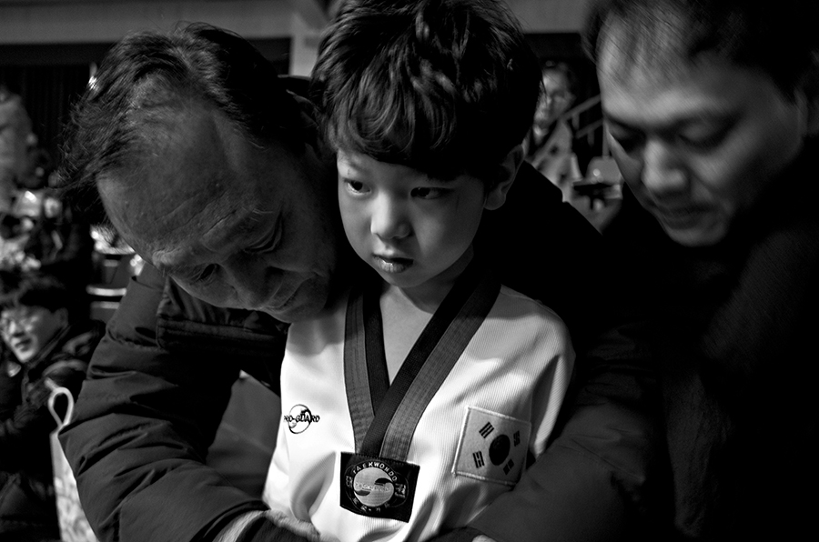 외할아버지와 아빠가 도복을 가다듬어 주고 있다.