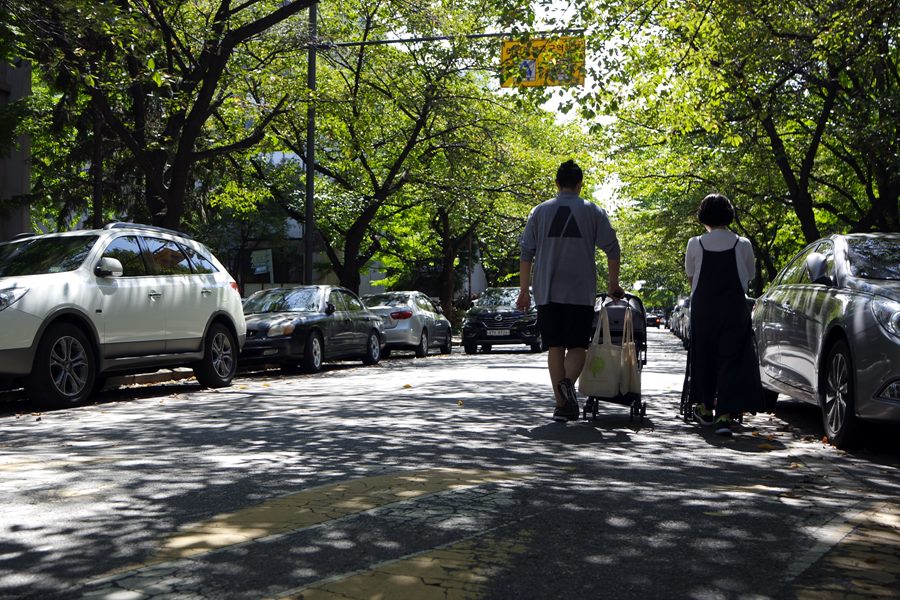 부부와 두대의 유모차...