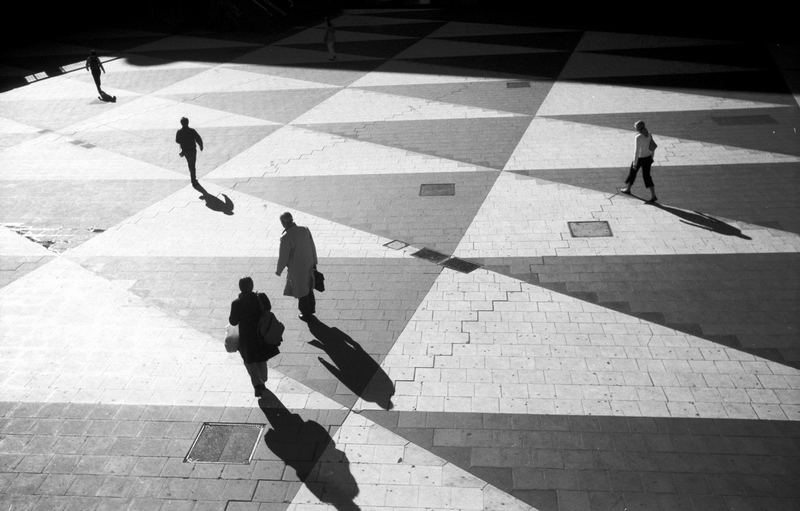 인물과 그 그림자의 상반된 진행 방향이