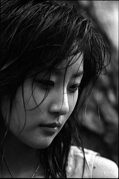 젖은 물기의 머리카락이 휘늘어지는