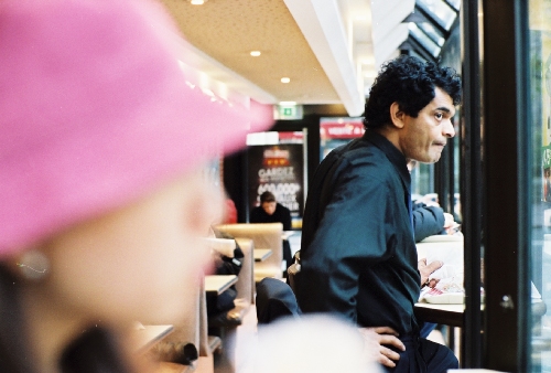 - 설명A man looking out the windows in McDonald's.