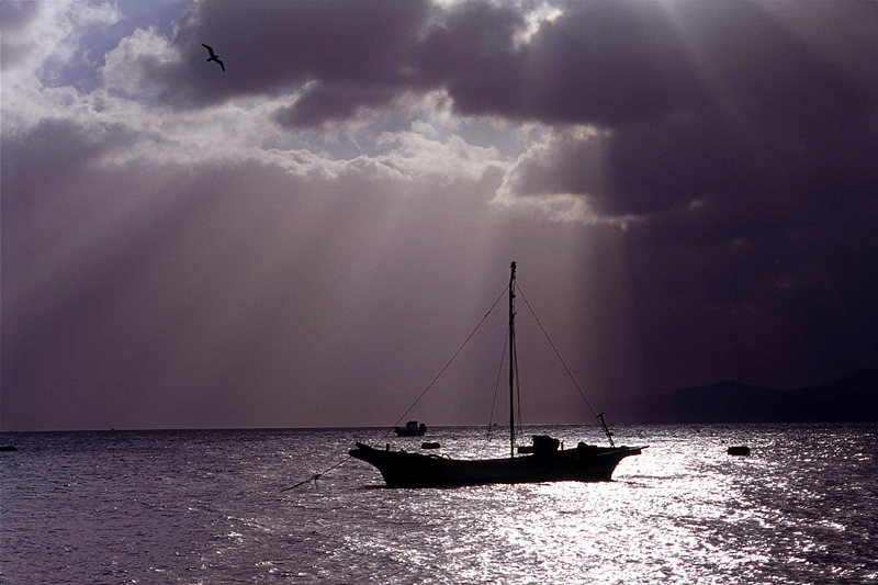 빛, 구름, 바다, 갈메기, 옛날배....