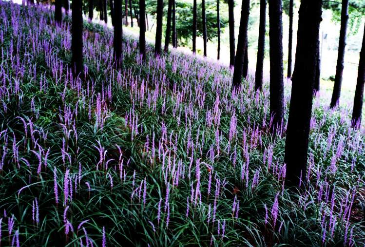 검은 나무 기둥(?) 아래 보라빛 꽃들이 신비하게만 보이는군요.^^
