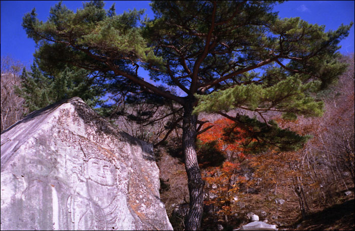 마애석불 사이로 가을이 찾아왔습니다.
