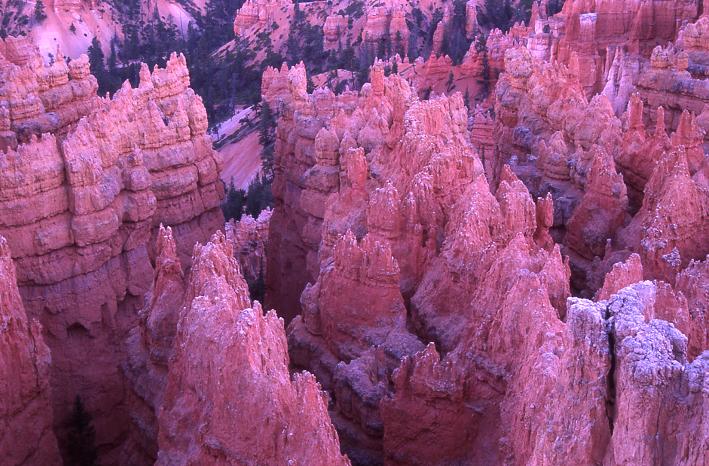 화려한 첨탑의 궁전이라고 하는 브라이스캐년은 자이언케년과 함께 있어며 자이언캐년은 남성적인 강한 느낌을 주는 반면 브라이스캐년은 여성적으로 화려하고 섬세한면이 있어며 수만개의 반원형극장의 모임이라고 할 정도에 많은 첨탑이 있습니다.