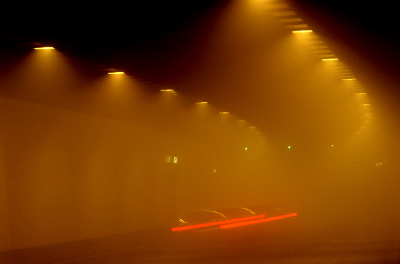 새벽에 터널 입구에서 양 방향 두 입구 가운데에