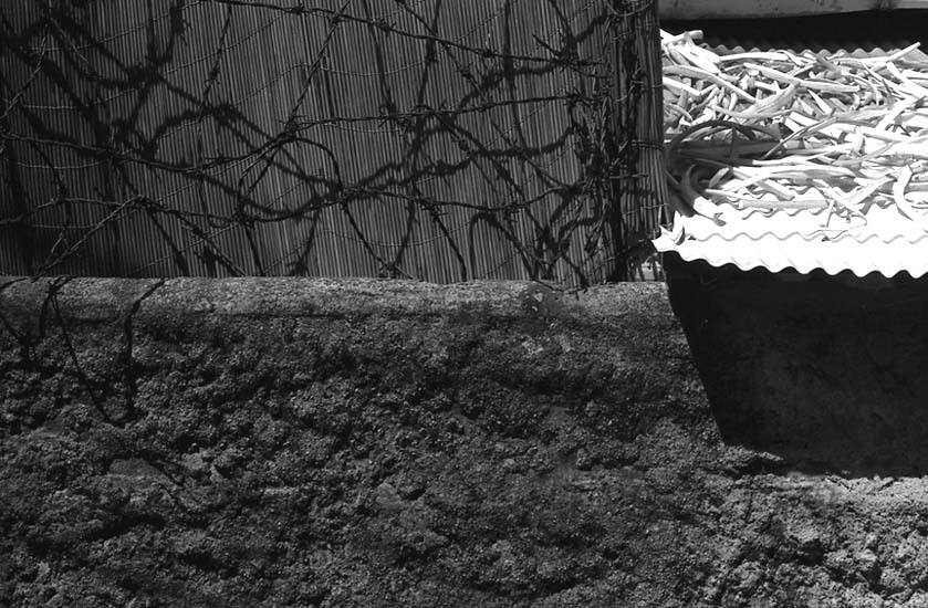 - 설명2006.9 시멘트로 모양을 낸 담벼락, 그 위에 쳐진 철조망, 스레트 지붕위에 말리고 있는 토란 줄기...