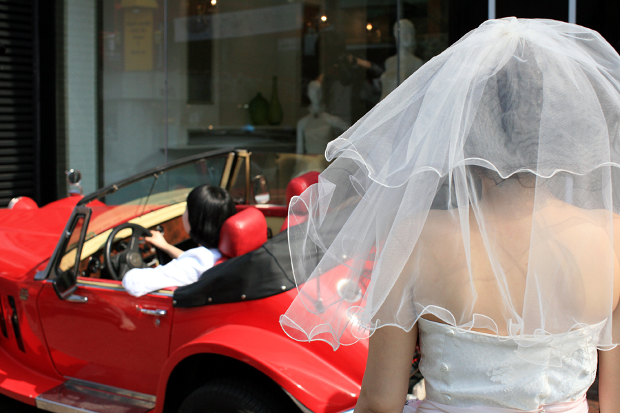 아름다운 신부에 뒷태에 멋진 레드카,