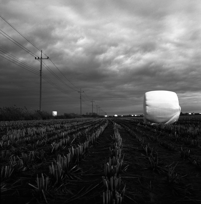 볏짚을 말아놓은 하얀 덩어리가 강렬하게 다가옵니다...