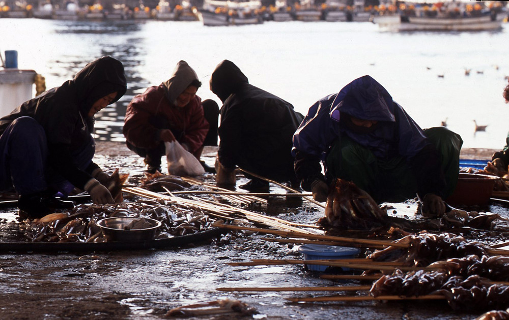 묵묵히 울릉도 오징어를 손질하십니다.