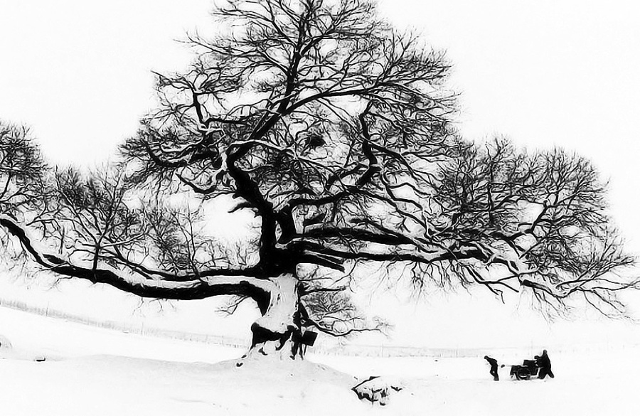 하얗게 눈으로 덮인 대지와 나무 그리고 수레 사람등