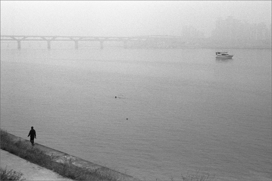 배와 부표, 그리고 사람 사이로 옅은 안개와 얽혀진