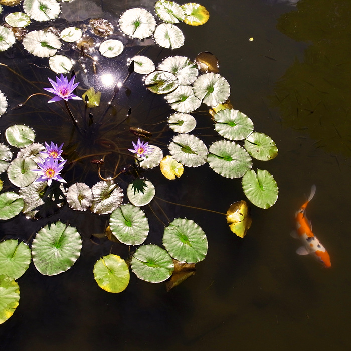 수련과 비단잉어의 모습이 예쁜 여인의 韓服에 놓은 한폭의 자수같이 보입니다.