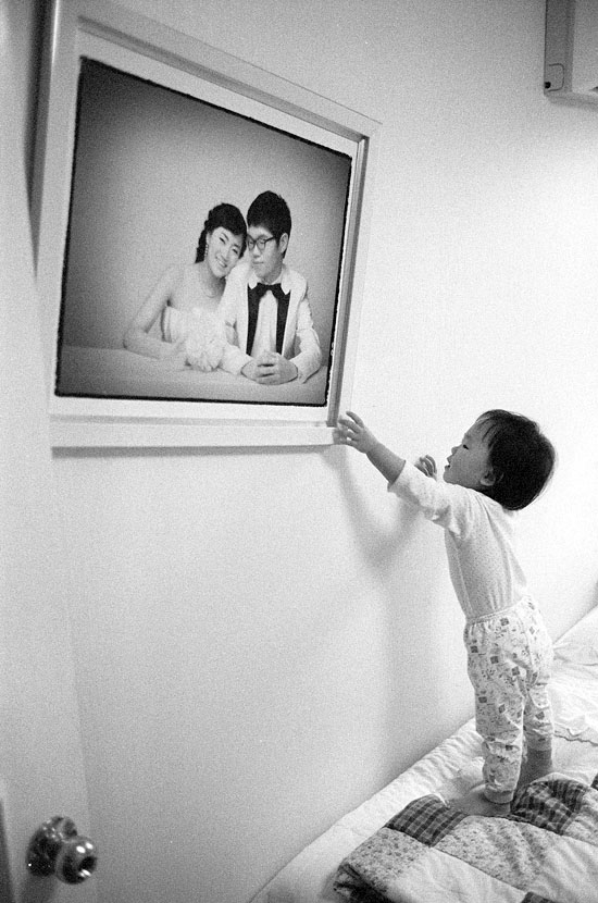 수아, 엄마와 아빠의 결혼사진을 흔들고 있습니다.
